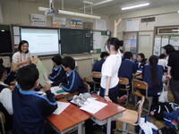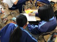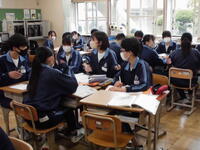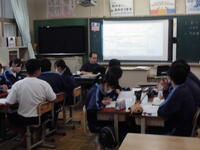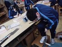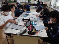 1年生は,家庭科でオリジナル巾着袋の製作でまつり縫いに挑戦しています。2年生は,技術科で自由設計ウッディスタンドの製作で木材を切ったりやすりをかけたりしています。3年生は,社会科で第一次世界大戦後にアジアで起こった民族運動についてグループで調べています。