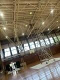 体育館のステージ側バスケットボールゴールの電動巻き上げ機とそのワイヤーが故障して、ずっと下げたままのバスケットボールゴールでしたが、修理が完了いたしました。