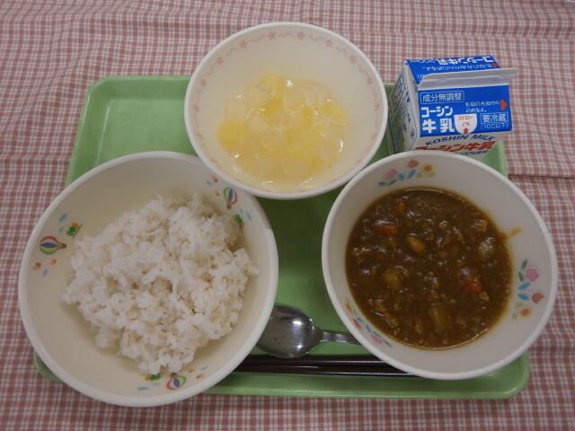 ・あめ色玉ねぎ入りカレー ・麦ご飯 ・りんご寒天和え ・牛乳