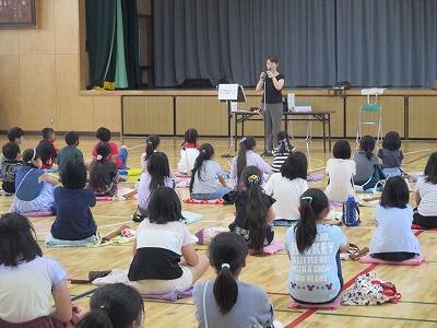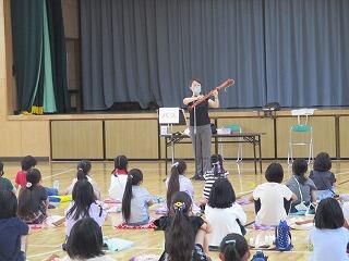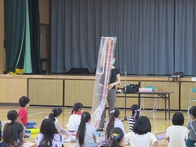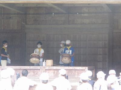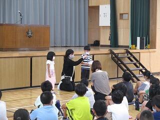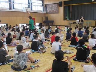 トップバッターは2年生です。国語の授業で習った「きつねのおきゃくさま」を鍵盤ハーモニカの演奏と劇で表現しました。体いっぱい使って演技をして、「きつねのおきゃくさま」のお話を見事に表現していました。6年生も2年生の時に学習した内容ですので、懐かしがりながら観ていました。