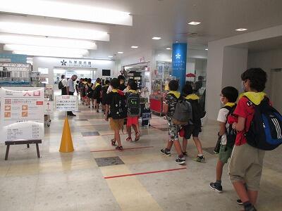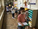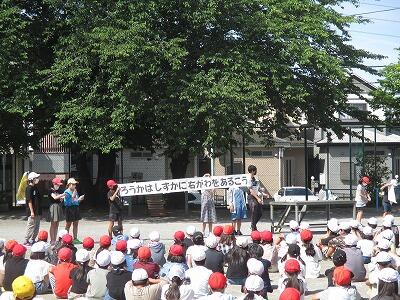 第2次避難は、より安全な校庭への避難です。今回は、避難経路を確認することも目当ての一つです。避難するときの合言葉「お・は・し・も」の確認を全校でしました。