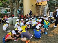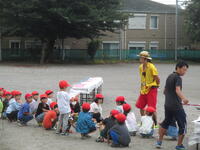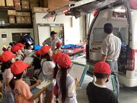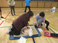沼南消防署の救命士さんがお話しをしながら、胸部圧迫の仕方をレクチャーしてくださいました。子どもたちも真剣な表情で取り組んでいました。