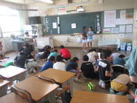 2年生が作ったクイズに答えていました。正解するとみんなで手をあげ、盛り上がっていました。