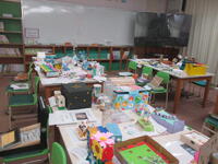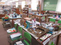 1年生の教室では、昔遊びです。けん玉、お手玉、1年生上手です。