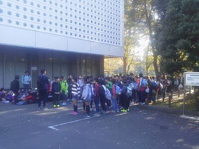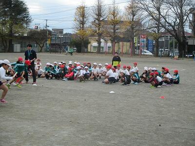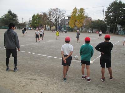 天気は良いですが風が冷たいです。4年生はサッカーをしています。