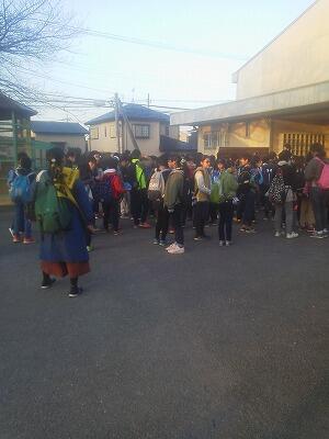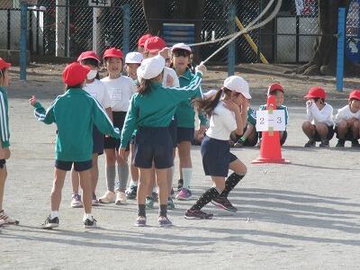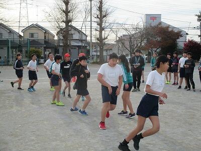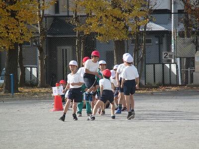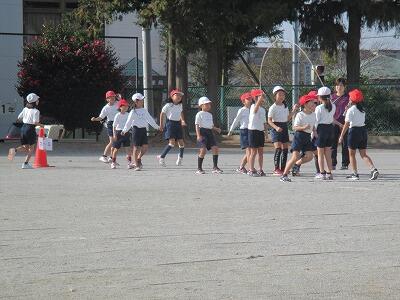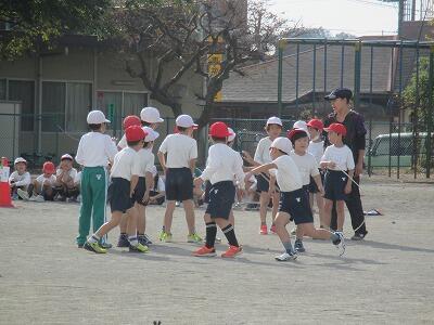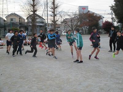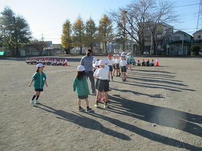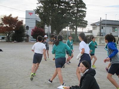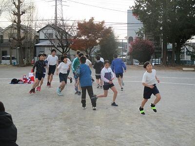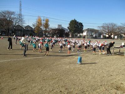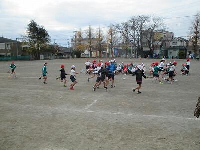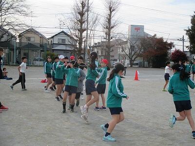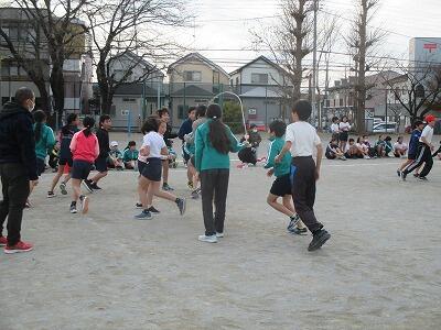 2クラスでリレーの対抗戦をしています。寒さに負けずに頑張っています。