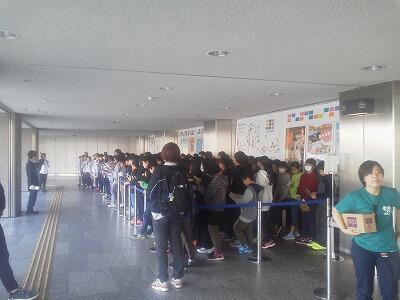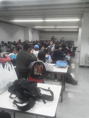 科学技術館の団体休憩室でお弁当です。小中学校が17校も来館していました。
