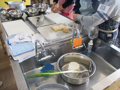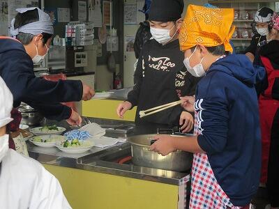 6年生がブロッコリーを茹で、粉ふきいもを作っています。