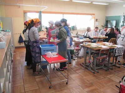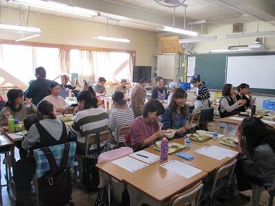 たくさんの保護者の方が試食会に参加してくださいました。今日の献立は給食のページをご覧ください。修学旅行代休の6年生教室を使っています。