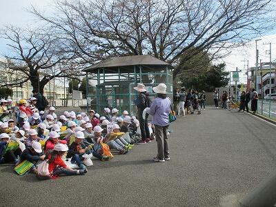 今日は町探検に出かけます。たくさんの保護者の方に協力いただいてグループごとに出発します。