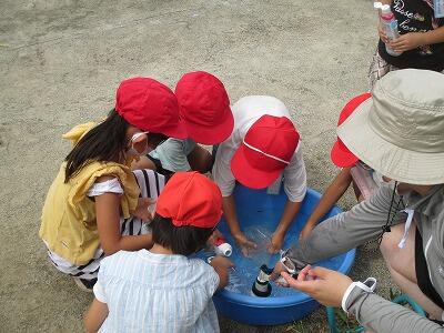 各家庭から持ってきた容器を利用して水鉄砲をしました。夏は水遊びがとても楽しいですね。