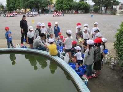 2年生が、野菜の苗を鉢植えしています。ミニトマト、ナスなど何種類かの野菜を育てます。