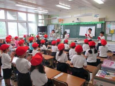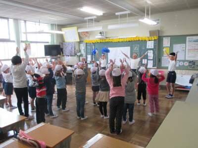 6年生の応援団員が、1年生の教室に来て指導しています。