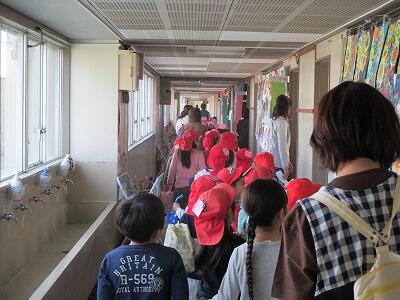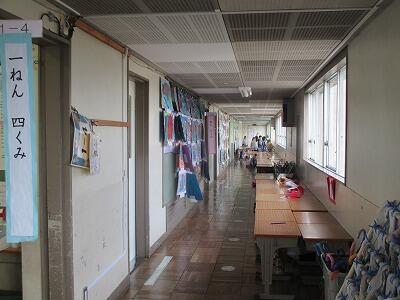 1年生は机を廊下に出して、明日の授業参観に発表することの練習をしています。