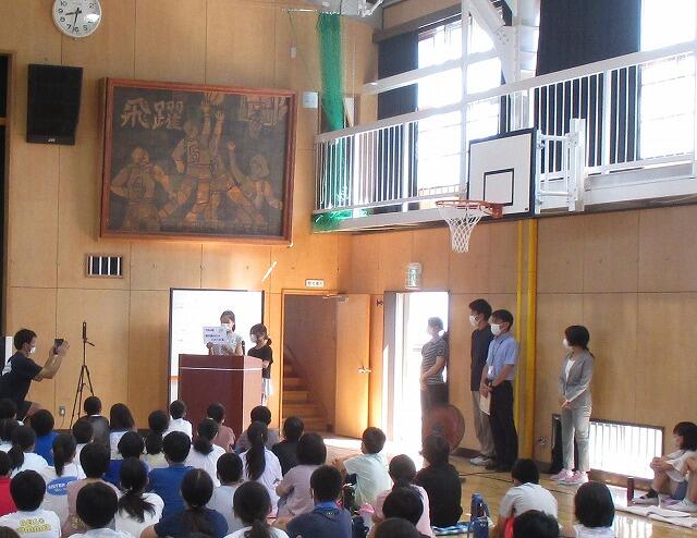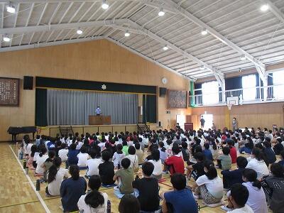全校朝礼は、校庭で全校そろって行う予定でしたが、あまりの暑さのため5・6年生は体育館で対面で行い、1年生から4年生はリモート形式で各教室で視聴する形をとりました。