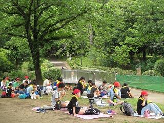 お楽しみのお弁当の時間です。天気予報では、時折雨が降るとのことでしたが、公園でお弁当を食べることができました。ここでも、同じ方向を向きながら間隔をとって黙食をし、感染対策をとりました。