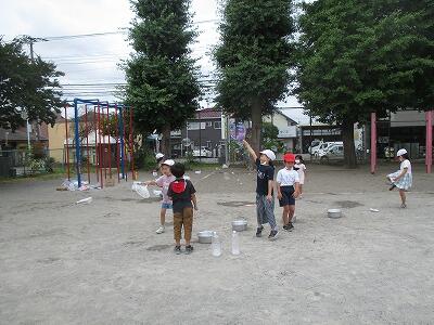 各家庭から持ってきた容器を利用して水鉄砲をしました。夏は水遊びがとても楽しいですね。