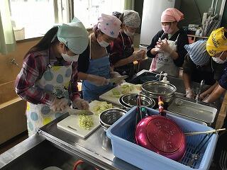 グループで分担し、野菜を丁寧に切っています。手袋をしながらだったので、やりづらかったと思いますが、とても上手に切ることができました。