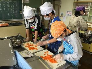 グループで分担し、野菜を丁寧に切っています。手袋をしながらだったので、やりづらかったと思いますが、とても上手に切ることができました。