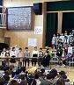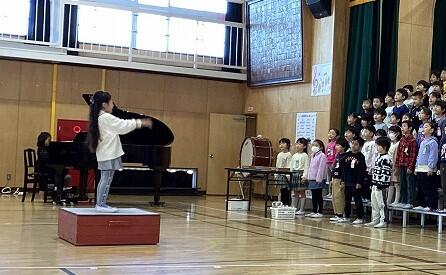 「ふるさと」と「with you smile」の合唱、演奏をしました。歌う姿勢が堂々としていて、最高学年の立派な姿を見せてくれました。伝統ある「ふるさと」をアカペラで歌い始め、とても美しい歌声が響きました。指揮者を中心に、ソプラノとアルトのハーモニー、力強いピアノ伴奏が見ている人たちを引き込み、感動的な演奏でした。