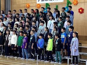 「こげよマイケル」と「大切なもの」の合唱、演奏をしました。三部合唱がきれいにハモっていて、高学年らしい素晴らしい歌声でした。高音がきれいに響いていて、歌詞を大切にしながら歌っていました。
