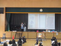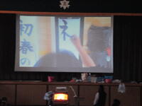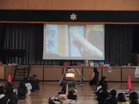 続いては6年生。まずは落合先生が、プロジェクターを使って、筆の使い方、文字を書くポイント等を解説してくださいます。