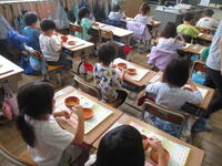 子供たちは、まずは普段の自分のお箸の使い方で、このふたつを器用に隣のお皿に移動させていました。そのあと、先生から正しいお箸の持ち方・使い方を教えてもらいました。