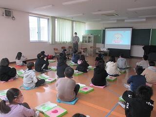 心臓マッサージの練習です。胸骨圧迫の感覚をつかんでもらうため,あっぱくんという子ども向けの練習用具を使っています。消防士さんが児童の人数分用意してくれました。