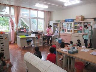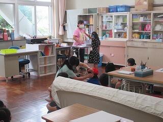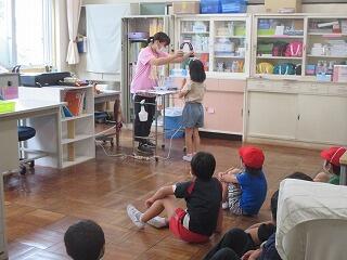 ヘッドホーンを付けて流れてくる音を聞きます。聞こえたら手を上げます。