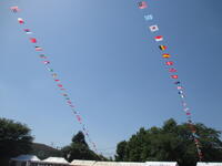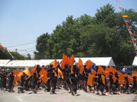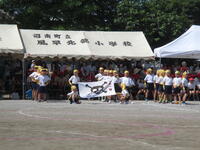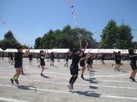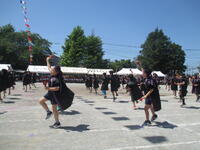 2年生の純走の次は、5、6年生の表現運動へと続きます。5年生は、自作のバチを持ち、6年生はフラッグをもって演技を披露しました。