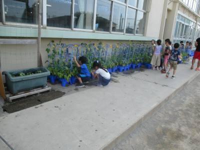 登校すると自分の朝顔に水やりをして育てています。花が咲くまではもう少しです。