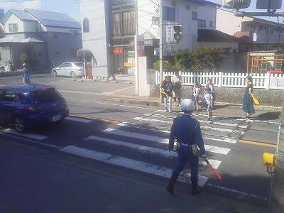毎朝、近隣や保護者の方が交通安全指導をしてくださっています。今朝は、柏の交通機動隊の方が2名来てくださいました。