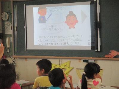 スマホや携帯電話の使用について、その危険性を知り、よく考えて慎重に扱うことの大切さを学習しています。