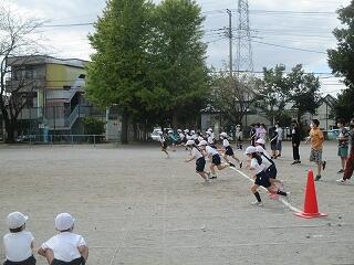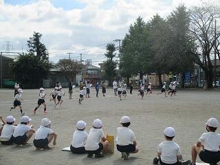 スポーツテストのシャトルランを1年生が実施しました。一定の距離を何往復できるかを数えます。模範として,6年生が一緒に走ったり,回数を数えたりしてくれました。6年生の応援があり,1年生も頑張って走っていました。