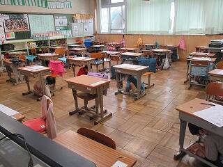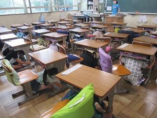 避難訓練を実施しました。今回は地震を想定し,緊急時地震速報の音が流れたら,机の下に頭を入れて,安全を確保するまでの第一次避難の訓練でした。