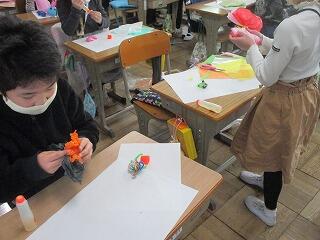 「くしゃくしゃ紙をへんしんさせよう」という学習課題で,お花紙や折り紙等を使って思い思いに工夫して,いろいろなものにへんしんさせていました。