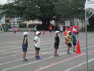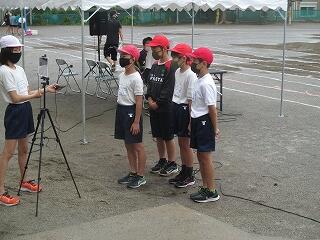 掛け声をかけないで練習するのは,難しいです。でも,1年生も頑張っていました。準備体操をしています。掛け声なしで,先生の合図に合わせています。