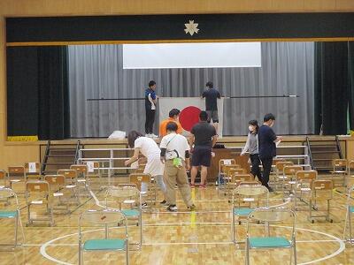 ステージには国旗 三密を避けるために,椅子と椅子の間隔を多めに確保しました。