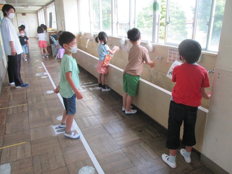 手洗いが上手にできます。順番を守って,間隔をとって並びます。1年生