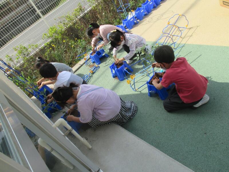 一年生が朝顔の種をまきました。早く芽が出るといいですね。水やりを頑張っています。