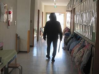 不審者役の先生がサングラスで変装。刃物?を持って登場。