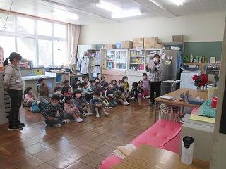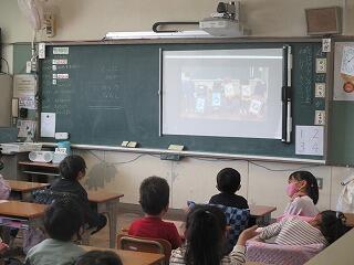図書の時間です。図書館指導員の大伯先生から本を紹介してもらっています。