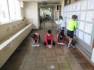 廊下も黙って磨いています。
