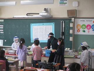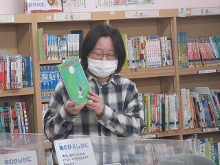 図書の時間です。図書館指導員の大伯先生から本を紹介してもらっています。