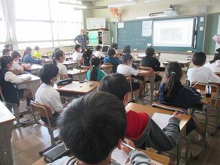 外国語の時間です。英語専科の英先生と外国語支援員福田先生が映像を見せながら,