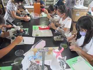 学校の池の水を採取して顕微鏡で微生物を観察しています。