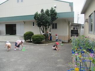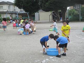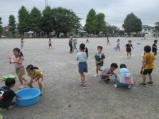 1年生が,水遊びをしていました。シャボン玉や水鉄砲で楽しんでいました。