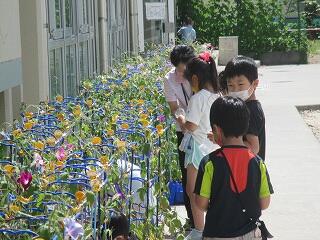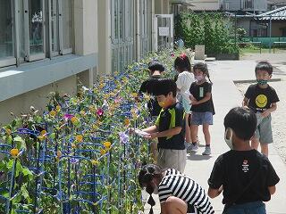 1年生が朝顔の花で色水を作っていました。