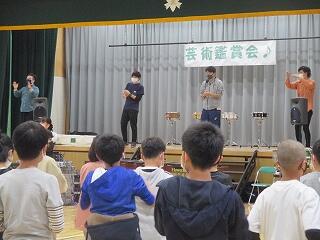 芸術鑑賞会 投稿日時 : 2021/11/05 風早北部小学校管理者 11月1日(月)芸術鑑賞会を実施しました。コロナでずっと延期になっていたので,本当に久々の楽しいイベントでした。 「フラワービート」というプロの音楽家のグループによる演奏を学年毎に鑑賞しました。 4人組のグループですが,皆テレビにも出演している有名な人ばかりでした。 マリンバのお姉さんのバチさばき・・・・・ 見とれてしまいました。 キッチンの道具を使って演奏してくれました。 先生もステージに上がって一緒に踊りました。 。 感謝の気持ちを込めて花束を贈りました。 {{options.likeCount}} {{options.likeCount}}
