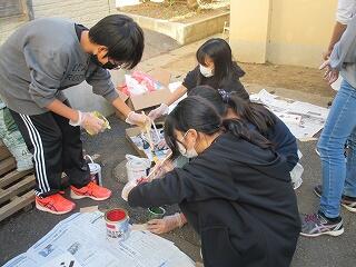 職員室前の池を掃除しています。 体育倉庫の掃除